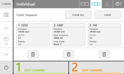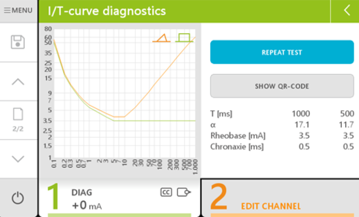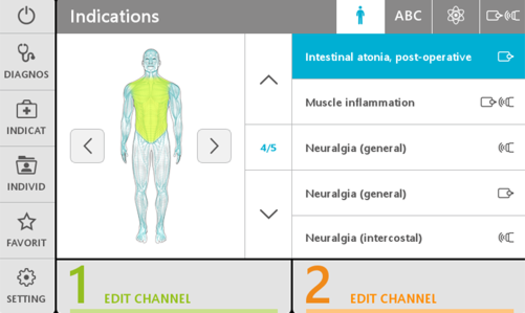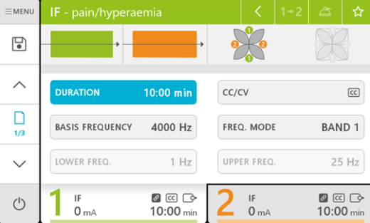 - Two-channel electrotherapy (21 currents) with basic settings on top level and detailed parameter settings in the expert menu (with visualization of the current shape parameters)