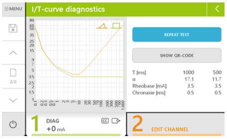 The new device distinguishes itself through simple, perfected operation, the combination of touch screen and PHYSIOMED one-button operation, the clear 7" colour screen with display of the most important parameters of active channels, two independent channels (with 21 current forms) with basic settings at the top level and detailed parameter settings in the expert menu (with visualisation of the electric current parameters) and many more features. Especially ingenious and time-saving: the new favorites menu with speed-dial memory for individual device functions. Spasticity treatment according to Hufschmidt/Jantsch as well as alternating and simultaneous stimulation are also possible. 6 diagnostic menus (incl. quick I/T curve representation) with user-guided navigation make the diagnostic evaluation self-explanatory and effective.